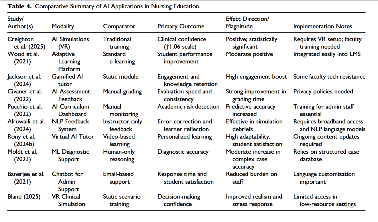“AI technologies encompass a wide range of applications within nursing education. These include intelligent tutoring systems for personalized learning, machine learning platforms