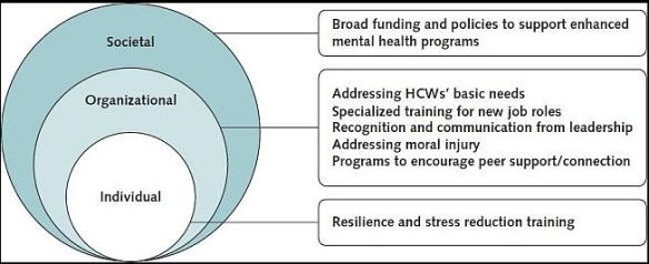 Recommendations for healthcare and hospital-support systems include the “assessment and promotion of coping strategies and resilience, special attention to frontline HCWs, provision of adequate protective supplies, and organization of online support services”.9
