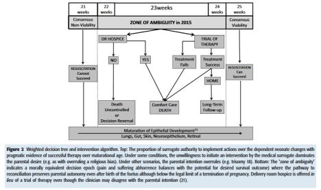“Physicians have a moral duty to maintain a therapeutic relationship with their patients in order to sustain a sense of moral community. We submit it is ethically appropriate to allow a mother to retain the informed choice whether to resuscitate her periviable child immediately upon birth when, in conjunction with the physician, the determination of what is in the best interest of the baby is unclear (zone of ambiguity). If she elects the option of no resuscitation, this delivery room hospice approach provides a commonly justified alternative at older ages to standard neonatal‘comfort care’ measures in association with a painless death for her child. If delivery is imminent and aborting in the clinical setting is not a desirable option, we should consider respecting maternal autonomy, by allowing a vaginal delivery with the promise of offering opioids to assuage the dying process in a patient at high risk for lifelong handicap as with any other hospice condition.”