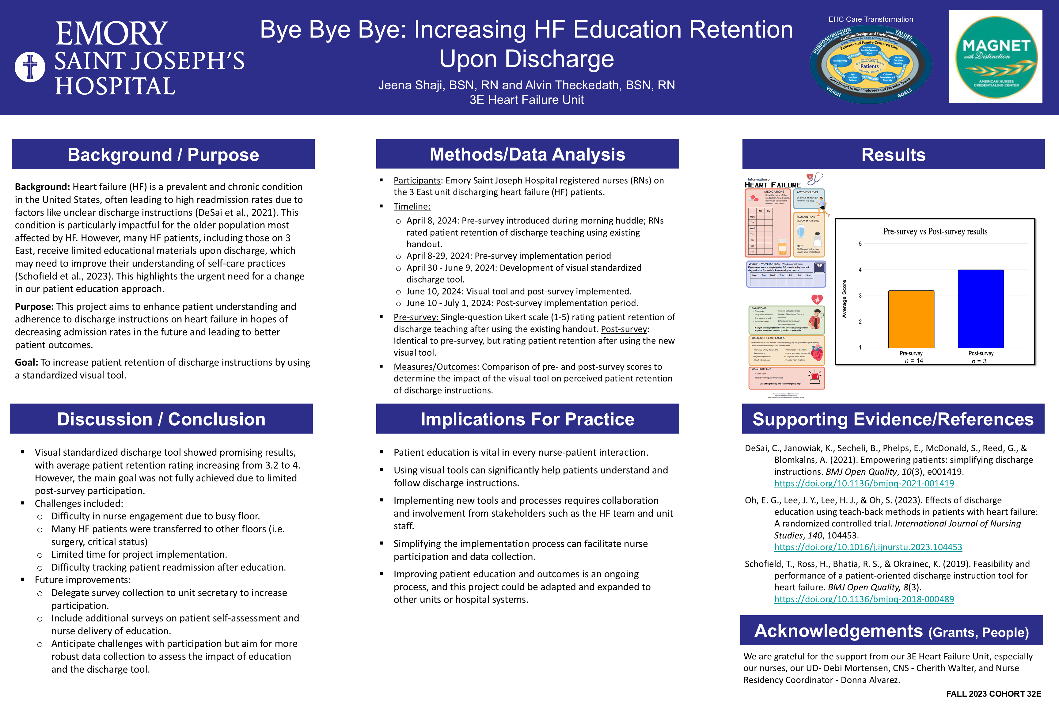 Shaji, J BSN, RN; Theckedath, A BSN, RN (2024) Bye Bye Bye: Increasing HF Education Retention Upon Discharge [Emory Healthcare Nurse Residency] Emory Saint Joseph’s Hospital, Atlanta GA