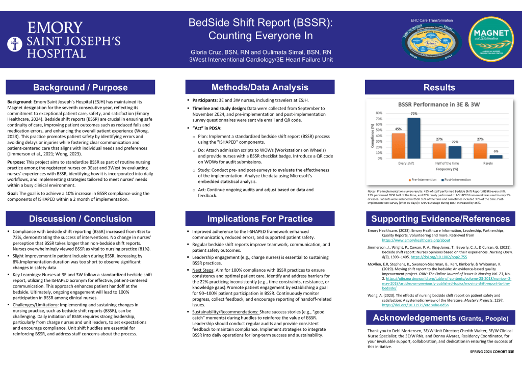: Emory Saint Joseph’s Hospital (ESJH) has maintained its Magnet designation for the seventh consecutive year, reflecting its commitment to exceptional patient care, safety, and satisfaction (Emory Healthcare, 2024). Bedside shift reports (BSSR) are crucial in ensuring safe continuity of care, improving patient outcomes such as reduced falls and medication errors, and enhancing the overall patient experience (Wong, 2023). This practice promotes patient safety by identifying errors and avoiding delays or injuries while fostering clear communication and patient-centered care that aligns with individual needs and preferences (Jimmerson et al., 2021; Wong, 2023).