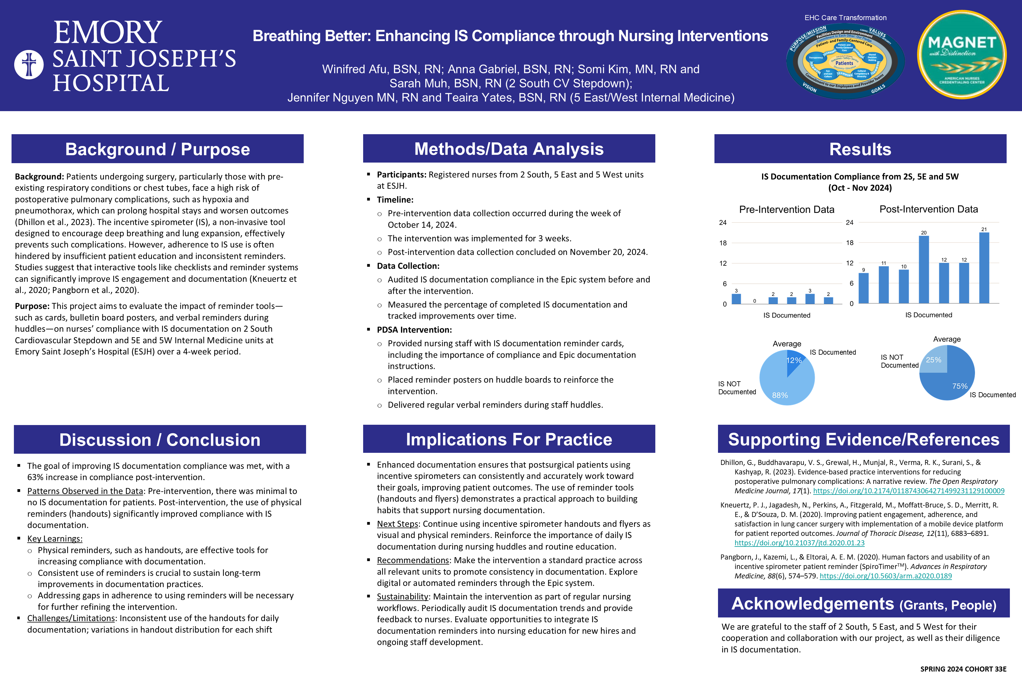Winifred Afu, BSN, RN; Anna Gabriel, BSN, RN; Somi Kim, MN, RN and Sarah Muh, BSN, RN (2 South CV Stepdown); Jennifer Nguyen MN, RN and Teaira Yates, BSN, RN (5 East/West Internal Medicine Breathing Better: Enhancing IS Compliance through Nursing Interventions [Emory Healthcare Nurse Residency] Emory Saint Joseph’s Hospital, Atlanta GA