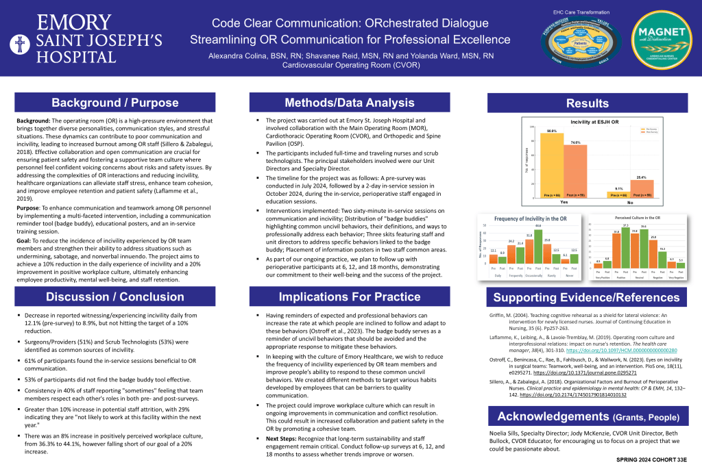 Alexandra Colina, BSN, RN; Shavanee Reid, MSN, RN and Yolanda Ward, MSN, RN Cardiovascular Operating Room (CVOR) Code Clear Communication: ORchestrated Dialogue: Streamlining OR Communication for Professional Excellence [Emory Healthcare Nurse Residency] Emory Saint Joseph’s Hospital, Atlanta GA