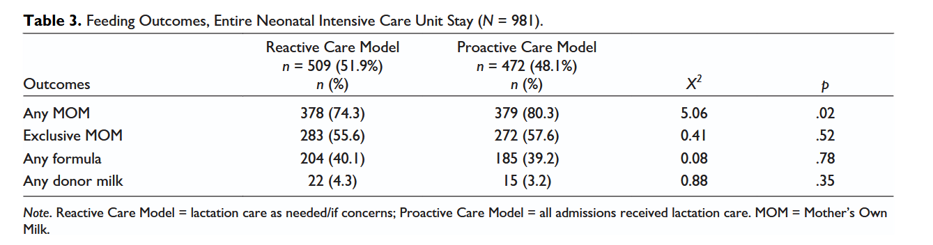 Hoban, R., McLean, L., Sullivan, S., & Currie, C. (2022). Proactive lactation care is associated with improved outcomes in a referral NICU. Journal of Human lactation, 38(1), 148-155.