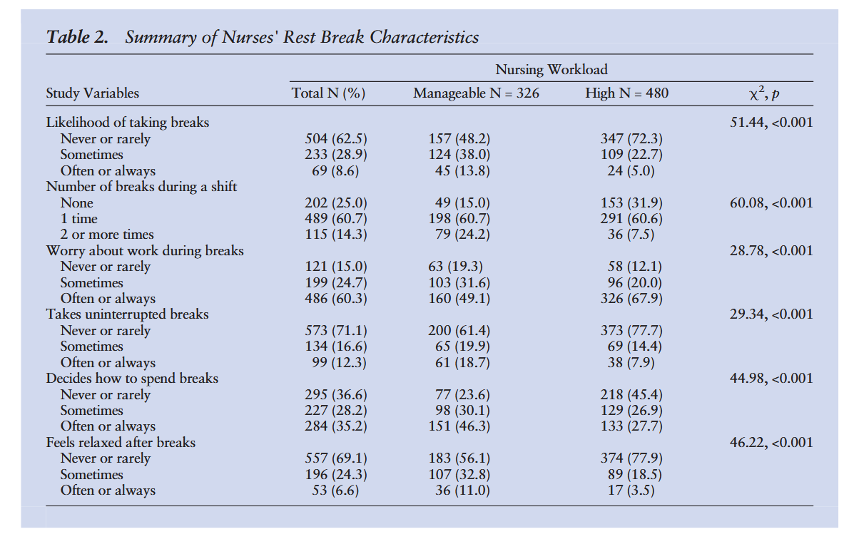 Sagherian, K., Cho, H., & Steege, L. M. (2023). The State of Rest Break Practices Among 12-Hour Shift Hospital Nurses in the United States. The Journal of nursing administration, 53(5), 277–283.