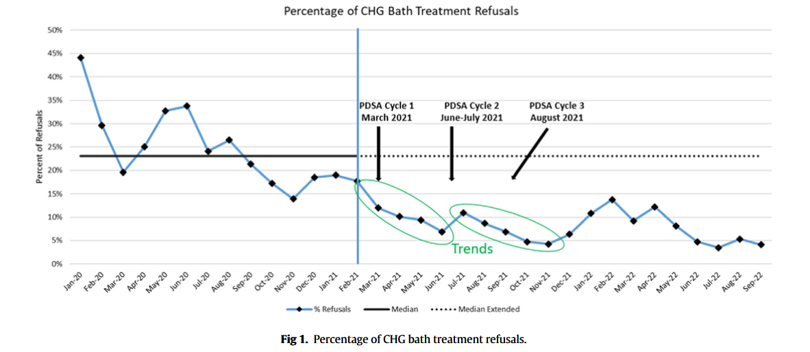 “This project found a reduction in patient refusals of CHG bathing after Plan-Do-Study-Acts (PDSA) cycles were initiated focused on this barrier. Continued efforts are needed to improve overall CHG bathing compliance and reduce CLABSI rates; however, this initiative showed that focused
