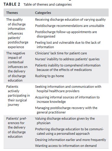 regain control of their life after discharge. Overcoming barriers to discharge education is essential to enhance patient comprehension and recollection of the information. Discharge education delivered using a patient‐centred approach provides opportunity to engage patients,