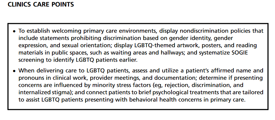 Heredia, D., et al (2021). LGBTQ-affirmative behavioral health services in primary care. Primary Care: Clinics in Office Practice, 48(2), 243-257.