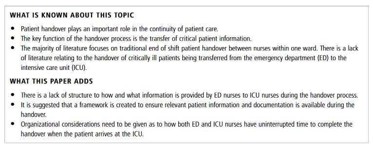 “The transfer of information between nurses from emergency departments (EDs) and critical care units is essential to achieve a continuity of effective, individualized and safe patient care. The aim of this study was to explore the process of patient handover between ED and intensive care unit (ICU) nurses when transferring a patient from ED to the ICU. Qualitative analysis of the data revealed that there was no structured and consistent approach to how handovers actually occurred. Nurses from both ED and ICU lacked clarity as to when the actual handover process began. Nurses from both settings recognized the importance of the information given and received during handover and deemed it to have an important role in influencing quality and continuity of care. Nurses from both departments would benefit from a structured framework or aide memoir to guide the handover process. Collaborative work between the nursing teams in both departments would further enhance understanding of each others’ roles and expectations.”