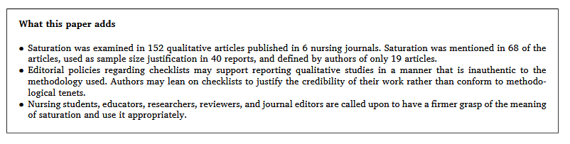 “The term saturation is used ubiquitously in reports of qualitative research. The term is often used, however, as a throw-away line, sans definition, rationale, or explanation of the process. Consequently, there remains a question about what is meant when saturation is used.The concept of saturation originated in grounded theory. Achieving theoretical saturation is one of the tenets of grounded theory. Over time, this specific and singular term has migrated to a general term that reflects various types of saturation such as code, data, theme, and meaning saturation. There is a lack of clarity among saturation types and a lack of transparency in reporting what is meant by saturation and how it was achieved. There is also a question about the relevance of saturation to qualitative methodologies outside grounded theory.”