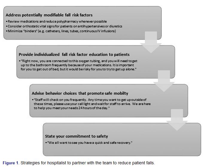 “Despite decades of fall prevention efforts, patient falls remain a common cause of harm in hospitalized older adults. While fall prevention strategies have been historically championed by nurses, hospitalist physicians, nurse practitioners, and physician assistants play a vital role in the multidisciplinary care team in ensuring the safety of our patients. Promising strategies for fall prevention include tailoring interventions to patient risk factors and individualized patient education. In addition to nursing-based interventions, the hospitalist’s role in fall prevention is to (1) identify and address potentially modifiable risk factors, (2) reinforce individualized education to patients, and (3) advise behavior choices that promote safe mobility.”